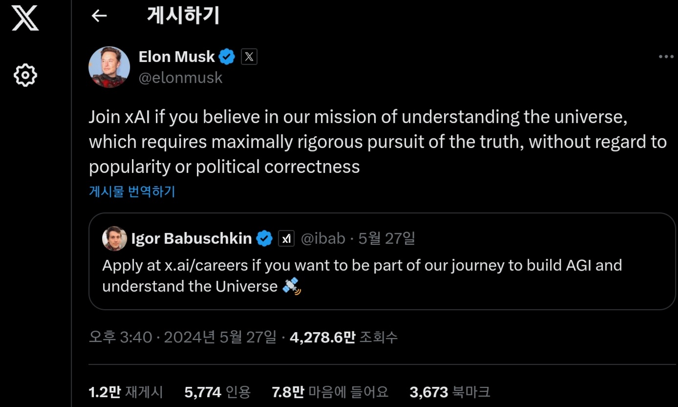 또한 머스크도 Babuschkin씨의 포스트를 인용하면서 「인기나 편견에 치우침 없이 진실을 최대한 엄격하게 추구하는 우주를 이해하려는 우리의 사명을 믿으신다면 xAI에 들어오세요」 라고 코멘트.