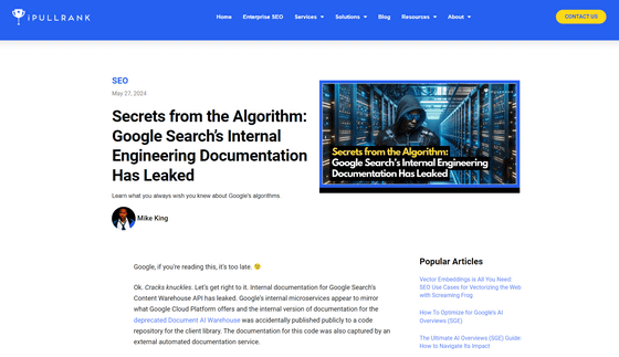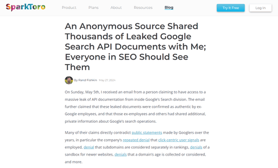 이번에 유출된 내부 문서는 웹사이트 해석 툴을 개발 · 제공하고 있는 SparkToro의 랜드 피쉬킨 씨가 '익명의 관계자'와 공유하고 공개한 것. 내용의 대부분은 2024년 3월 시점의 최신 정보라고 확인되었습니다.