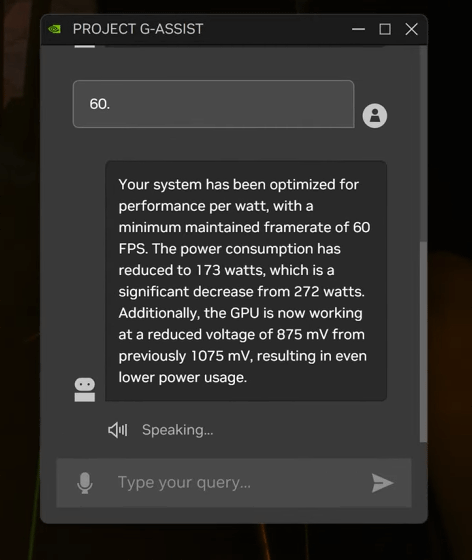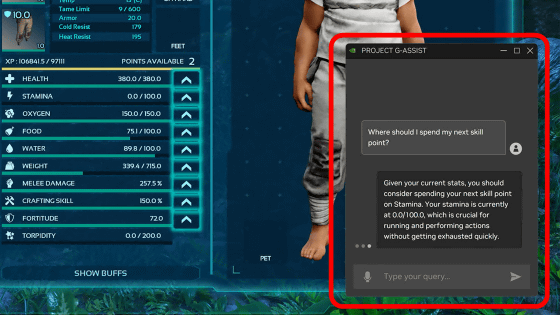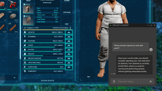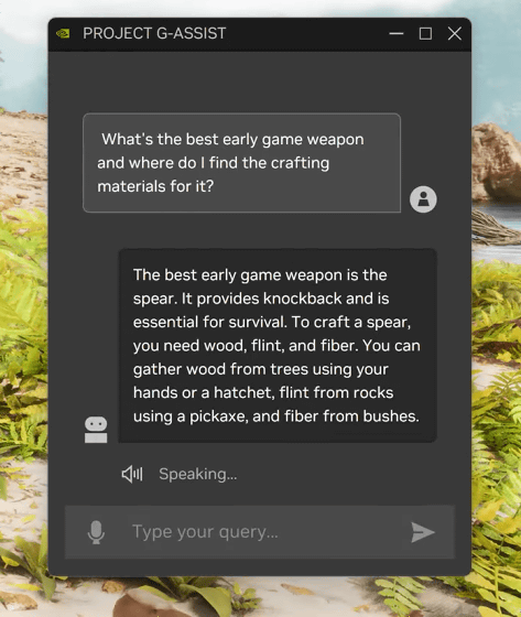 NVIDIA는 「ARK: Survival Ascended」 의 개발 스튜디오인 Studio Wildcard와 협력해 Project G-Assist의 데모판을 구축했습니다. Project G-Assist 화면은 게임 화면에 오버레이 표시되며, 질문은 텍스트 또는 음성으로 입력할 수 있습니다.
