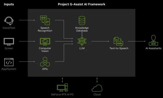 게임을 플레이할 때 「어떤 무기가 강한가」, 「스테이지의 공략법」 등을 인터넷으로 한 번쯤은 검색한 경험이 있을 것입니다. Project G-Assist는 인터넷 검색 대신 사용할 수 있는 AI 어시스턴트를 목표로 개발 중이며, 게임마다 "개발자로부터 제공된 데이터를 학습한 AI 모델"을 준비해 최적의 응답을 하도록 조정되었습니다. 또한 Project G-Assist는 클라우드에서 실행하거나 로컬에서 실행할 수 있습니다.