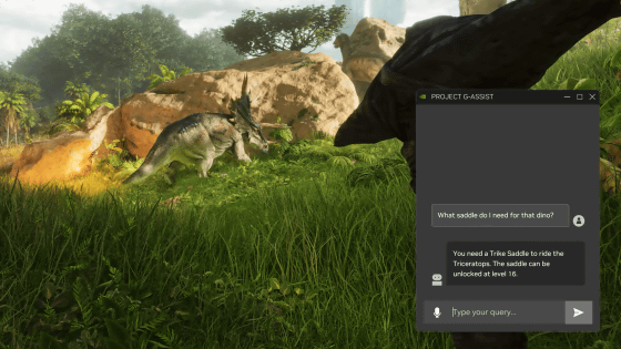 또한 Project G-Assist는 게임 화면에 표시된 것을 파악하여 답할 수 있습니다. 아래 예에서는 화면에 공룡이 비친 상태에서 "저 공룡을 타려면 무엇이 필요?"라고 질문한 결과 Project G-Assist가 화면의 공룡을 트리케라톱스라고 올바르게 인식하고, 트리케라톱스를 타는 방법을 알려줍니다.