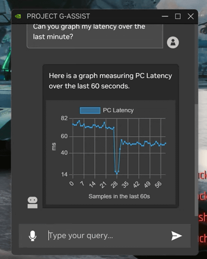Project G-Assist는 게임의 공략 정보뿐만 아니라 게임의 화질 설정도 도와줍니다. 예를 들면, 다음의 예에서는 게임 플레이 처리 지연을 그래프화 하여 보여줍니다.