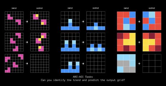 제출된 AGI의 성능을 측정하는 데 있어서 중요한 것이, 쇼레 씨가 발표한 논문 「On the Measure of Intelligence」 에서 소개된 「ARC-AGI」 라는 지표입니다. ARC-AGI는 AI가 제공하는 암기력 이외의 성능을 테스트합니다. 다음 예제는 "위의 두 범례를 기반으로 아래의 빈칸으로 올바르게 채우시오."라는 작업입니다.