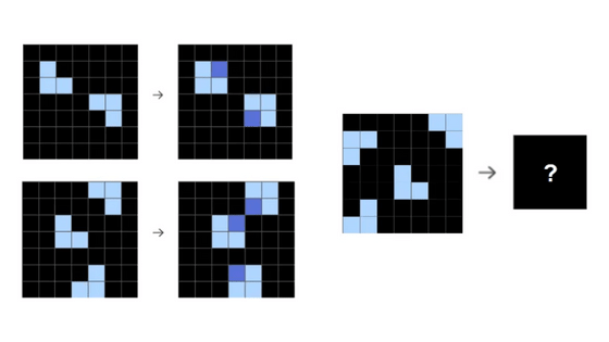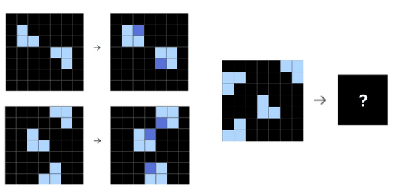 ARC-AGI는 아래 그림과 같이 몇 가지 예와 문제를 제공합니다. 예제에서 규칙을 유추하여 빈칸을 채우면 됩니다. 인간은 아이라도 85%에서 100%의 점수를 낼 수 있지만, 지금까지 AI가 내놓은 ARC-AGI의 최고 점수는 34%이며, 수많은 벤치마크 중에서도 특히나 인간과의 차이가 심했습니다.