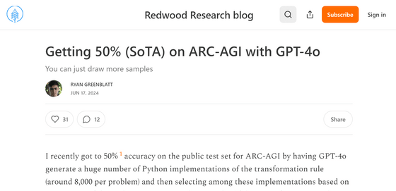 AI 연구원 라이언 그린 브라트 씨가 AI의 일반적인 추론 능력을 평가하는 지표인 ARC-AGI에서 GPT-4o를 사용함으로써 50%라는 정답률을 달성할 수 있었다고 발표했습니다.