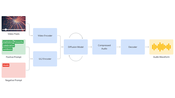 V2A 시스템은 먼저 입력된 영상을 인코딩하고 이를 바탕으로 확산 모델이 랜덤 한 노이즈로부터 반복음을 생성합니다. 그리고 영상과 프롬프트와 일치하는 사실적인 음성이 생성되면 디코딩하여 음성 데이터와 영상을 합성합니다.