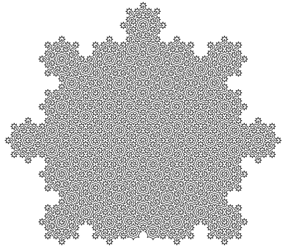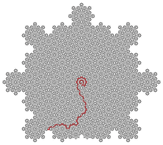 영국 브리스톨 대학의 이론 물리학자인 펠릭스 플리커 등의 연구팀은 이번 연구에서 프랙털 기하학과 체스 조각의 움직임을 탐구하는 수학적 퍼즐 '나이트 투어'에서 착상을 얻어, 준결정이라고 불리는 자연적으로는 거의 볼 수 없는 물질의 패턴을 설명하는 알고리즘을 도출했습니다. 다음은 미로의 예입니다.