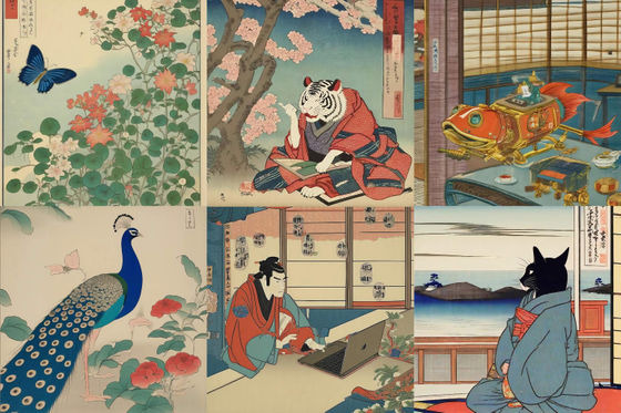이렇게 만들어진 Evo-Ukiyoe는 벚꽃, 후지산, 기모노, 새 등 우키요에에서 자주 다루는 요소를 프롬프트 하여 우키요에에 가까운 이미지를 생성할 수 있습니다. 한편, PC나 햄버거 등 에도 시대에는 존재하지 않았던 것을 프롬프트로 사용하면, 화상은 생성할 수 있지만 우키요에답지 않은 것이 될 가능성이 있습니다.