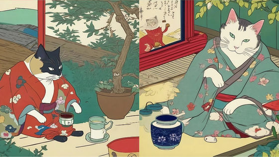그리고 다음은 「기모노를 입고 있는 고양이가 정원에서 차를 마시고 있다. 최고 품질의 야(輻)노 우키요에」 라는 프롬프트로 출력한 결과입니다.