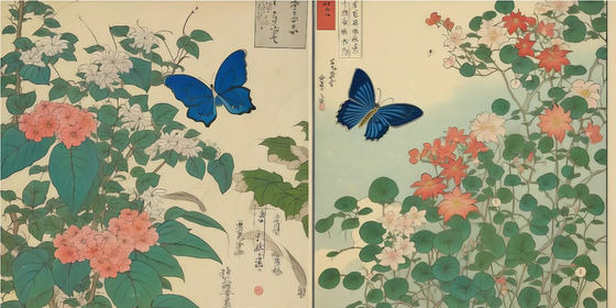 예를 들어, 「식물과 꽃이 있다. 나비가 날고 있다. 최고 품질의 야(輻)노 우키요에」 라는 프롬프트를 사용하면 아래와 같은 그림이 됩니다. 덧붙여, 「야(輻)노 우키요에」 라는 것은 학습 시에 사용한 특수 토큰, 즉 특정 기능을 부여하기 위해, 일반 단어와는 다른 학습을 시킨 토큰입니다.