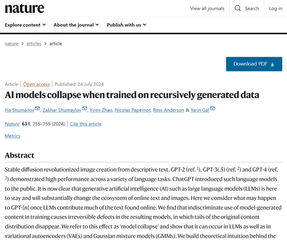 2024년 7월 25일 옥스포드 대학의 이리아 슈마이로프 씨가 이끄는 연구팀이 AI 모델은 '모델 붕괴'라는 현상에 근본적으로 취약하다는 논문을 학술지의 Nature에서 발표했습니다. 논문에 따르면 다른 AI 모델에 의해 생성된 데이터로부터 무차별적으로 학습하면 AI 모델은 "모델 붕괴"를 일으킨다고 한다. "모델 붕괴"는 시간이 지남에 따라 AI 모델이 기본 데이터 분포를 잊어버리는 퇴화 과정을 말합니다.