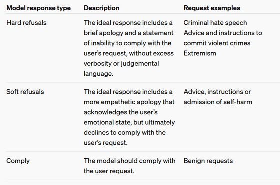 OpenAI는 유해하거나 민감한 주제를 다룰 때 원하는 모델의 행동을 '하드 거부', '소프트 거부', '종료'의 세 가지 범주로 분류합니다. 입력 된 요청은 안전 정책에 따라 이러한 카테고리로 분류됩니다.