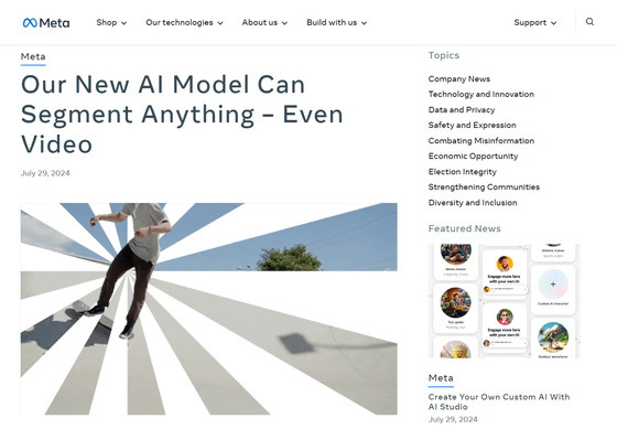 어떤 픽셀이 어떤 객체에 속하는지 올바르게 식별하는 "세그먼테이션" 호출되는 작업은 과학적 이미지 분석 및 사진 편집과 같은 작업에 유용합니다. Meta는 독자적인 세그멘테이션 AI 모델로서 Segment Anything Model(SAM) 을 개발하고 있어 Instagram의 AI 기능인 「Backdrop」나 「Cutouts」에 활용되고 있습니다.