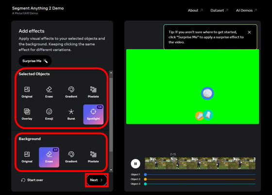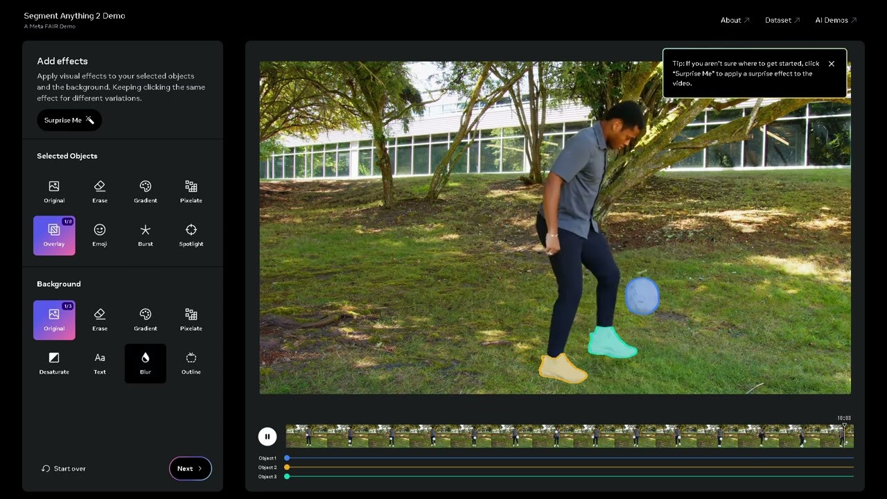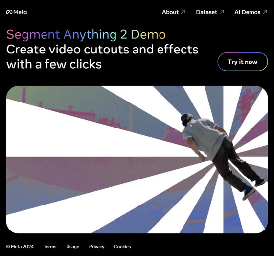 Meta는 SAM 2의 데모용 웹 앱도 공개하고 있으며, 그 세그멘테이션 능력의 높이를 실감할 수 있습니다.