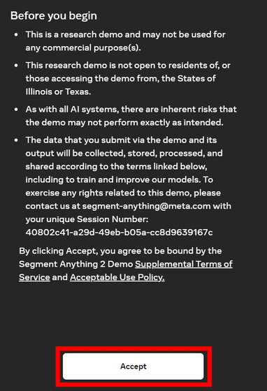 그러면 메모가 표시됩니다. SAM 2의 데모는 어디까지나 연구용이므로, 상업적 목적으로는 이용할 수 없습니다. 또한 일리노이 주와 텍사스 주 거주자는 이 데모를 사용할 수 없습니다. 게다가 데모가 의도한 대로 동작하지 않을 가능성이나 데모를 통해 전송된 데이터와 그 출력은 아래의 링크처의 규약에 따라 수집·저장·처리·공유되어 AI 모델의 트레이닝과 개선에 사용되는 것으로 기재되어 있습니다. 화면 하단의 "Accept"를 클릭합니다.