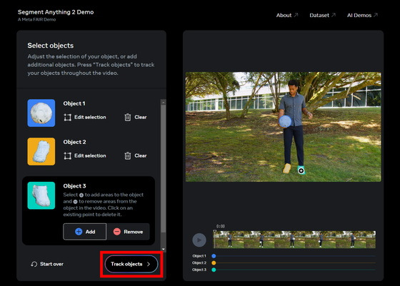 오브젝트는 동시에 3개까지 식별 가능. 개체를 선택한 후 Track objects를 클릭합니다.