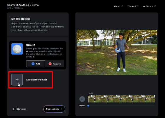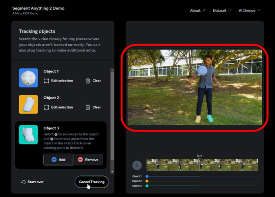 SAM 2의 데모의 모습을 촬영한 것이 이하의 동영상.