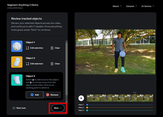 그러면 빨간색 프레임 부분의 동영상이 재생됩니다. 공과 신발은 모두 백색을 기조로 하고 있어, 2개가 겹치는 순간도 많이 있습니다만, SAM 2는 정확하게 각각의 오브젝트를 식별하는데 성공하고 있습니다.