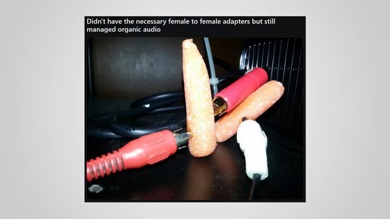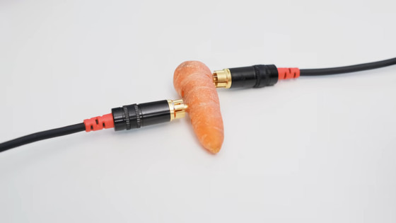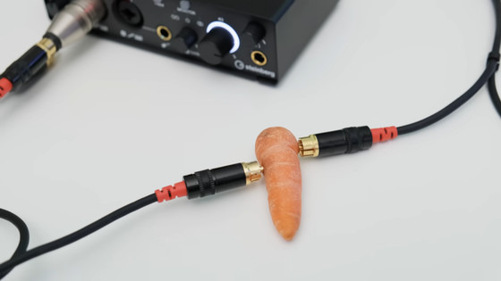 계기가 된 것은 Reddit의 투고로, 사진을 보면 아무 가공도 하고 있지 않은 당근에 오디오 케이블을 직접 꽂은 것 밖에 보이지 않습니다.