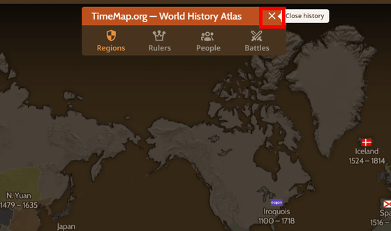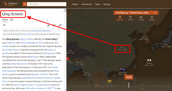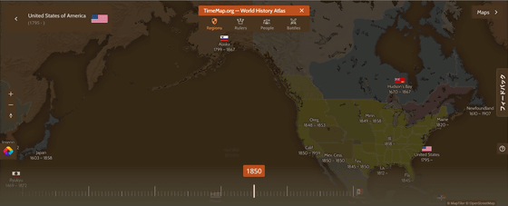 세계지도는 영구적이지 않으며, 시대에 따라 지명이나 국가명, 지형이 바뀌기도 합니다. 「Timemap」에서는 세계지도와 타임라인이 세트로 되어 있어, 시간을 움직여 당시의 지명이나 발생한 전쟁등의 역사를 거슬러 올라가면서 볼 수 있습니다.