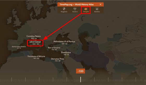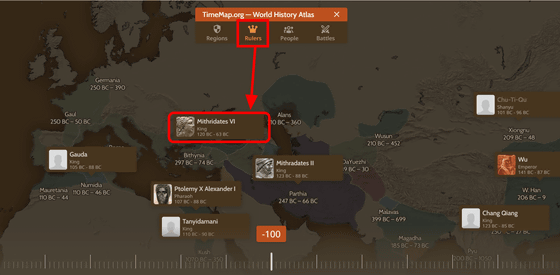지도 위에 있는 메뉴에서 「Rulers(군주, 통치자)」를 선택하면, 그 시대의 나라나 지역을 통치하고 있던 사람이나 군주의 이름이 표시됩니다. 유럽의 「Rulers」를 표기하니, 기원전 120년부터 기원전 63년까지 폰토스의 국왕을 맡은 미트리데테스 6세 등, 그 시대의 국왕을 알 수 있었습니다.