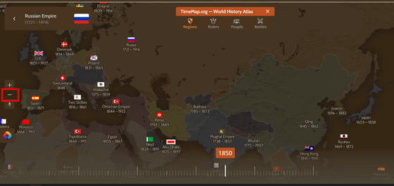 Timemap의 특징은 타임라인을 움직여 시대를 바꿔가며 세계 지도를 볼 수 있다는 점에 있습니다.