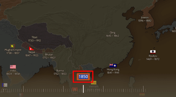 다음과 같은 지도가 열렸습니다. 지도의 하단에 타임라인이 있어, 「1850년」이 되어 있었기 때문에, 한국은 「조선왕조」라고 나오네요.