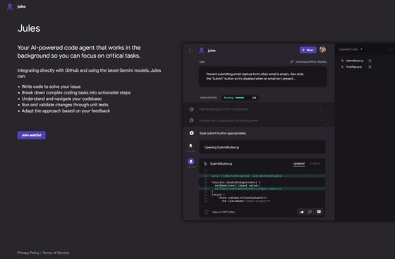 Jules에 대해 IT계 뉴스 사이트 VentureBeat는 "개발자가 자고 있는 동안 소프트웨어의 버그를 자동으로 수정해, 코드의 변경을 준비할 수 있는 AI 코딩 어시스턴트"라고 표현했습니다.