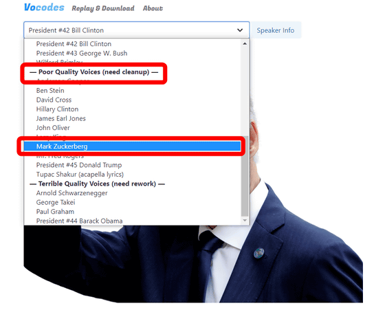 인물마다 생성되는 소리의 퀄리티는 다른 것 같고, Facebook의 마크 저커버그 CEO는 "Poor Quality Boices(낮은 품질의 목소리)"라고 되어있습니다.