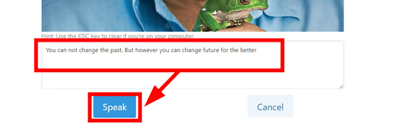 얼굴 사진 바로 아래에 있는 입력란에 낭독을 원하는 문장을 입력하고 'Speak'를 클릭합니다. 여러 번 시도했는데, 긴 문장은 오류가 날 수 있기 때문에 이번에는 'You can not change the past. But however you can change future for the better.(과거는 바꿀 수 없다. 그러나 미래를 더 나은 쪽으로 변화시킬 수는 있다)"이라는 비교적 짧은 문장을 넣어봤습니다. (영어만 가능합니다)