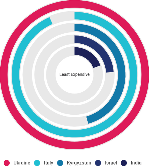 위의 인도를 포함한 '1GB 당 모바일 데이터가 가장 싼 나라 Top 5'의 그래프가 아래입니다. 안쪽부터 인도(0.09 달러 / 약 107원), 이스라엘(0.11 달러 / 약 130원), 키르기스스탄(0.21 달러 / 약 249원), 이탈리아(0.43 달러 / 약 510원), 우크라이나(0.46 달러 / 약 546원)입니다.