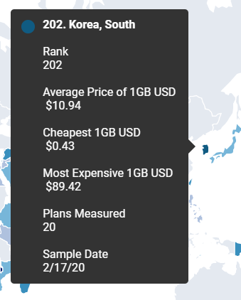 남한의 순위는 228개국 중 202위로 아주 높은 부류에 랭크되어 있습니다. 1GB 당 평균 가격은 10.94 달러(약 13,000원)로 인도의 120배가 넘습니다. 최저가는 0.43 달러(약 510원), 최고값은 89.42 달러 (약 10만 6천 원)입니다.