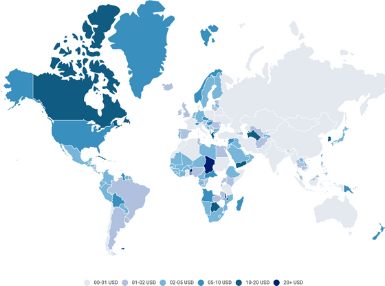 아래는 Cable.co.uk이 만든 지도로, 1GB 당 통신료가 높은 나라일수록 진한 색으로 표시되고 있습니다.