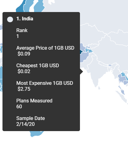 228개국 중 가장 저렴했던 인도는 1GB 당 평균 가격은 0.09 달러(약 107원)이었습니다. 인도의 모바일 데이터가 이렇게 저렴한 이유에 대해 Cable.co.uk는 "인도는 젊은 인구가 많고 테크놀로지에 대한 의식도 높은 데다, 스마트폰 시장에서 활발하고도 치열한 경쟁이 벌어지고 있습니다. 따라서 모바일 데이터가 놀라울 정도로 저렴하게 제공되고 있습니다."라고 분석하고 있습니다.