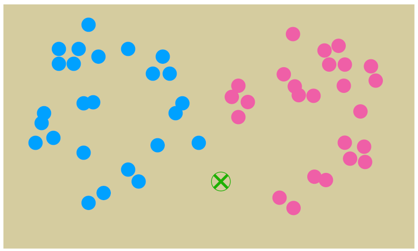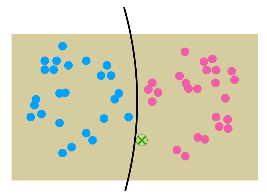 예를 들어, 아래의 그림 같은 느낌으로 변이 떨어져 있었다고 합시다. 빨간 점이 그룹 1의 배설물이고, 파란 점이 그룹 2의 배설물이 있던 자리입니다. 그럼 그림의 녹색 'X'의 위치는 어느 그룹의 영역이 되는 것일까요?