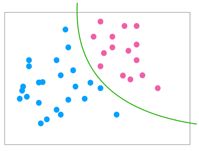 이렇게 점이 섞여 있으면 경계선을 그리기가 쉽지 않습니다. 그러나 이런 문제도 아래 그림처럼 약간의 미스를 허용하고 경계선을 그어 버리면 아직 모르는 데이터에 대한 예측성능(일반화 가능성)이 높아지는 경우가 많습니다. 왜냐하면 세상의 대부분의 문제는 적지 않은 예외가 존재하기 때문입니다.
