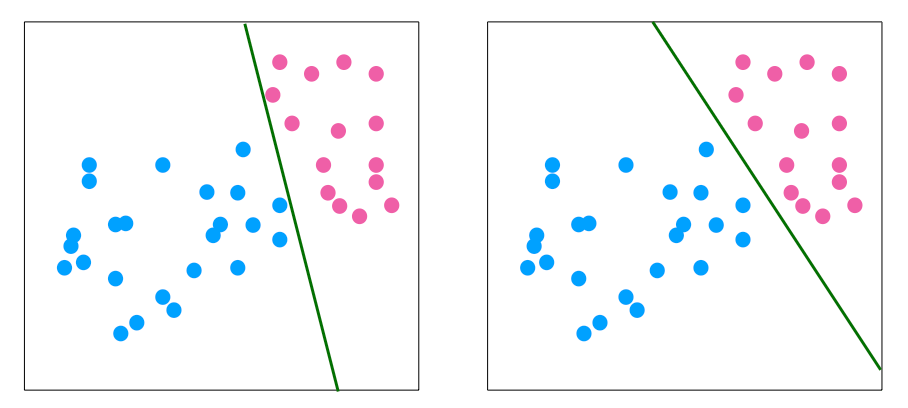 어느 쪽이 좋아 보이나요? 분명 오른쪽일 것입니다. 왼쪽 것은 점과의 거리가 너무 가깝습니다. 다른 그룹의 점 바로 근처에 새로운 점이 나타날 수 있기 때문에 새로운 점을 잘 분류할 것 같지 않습니다.