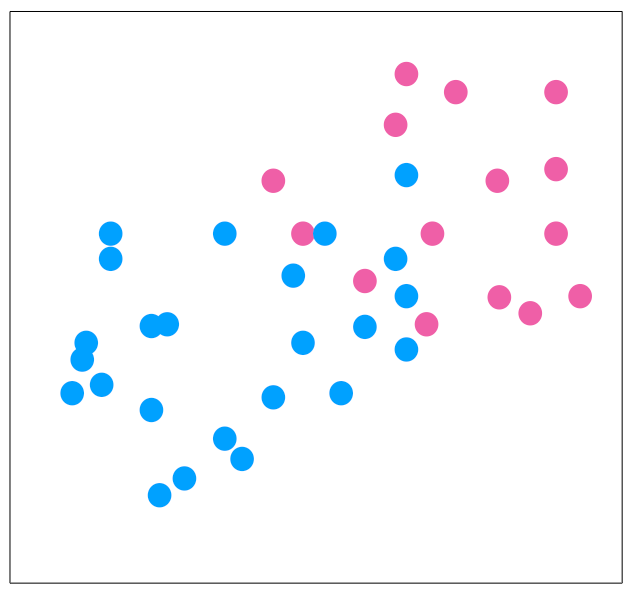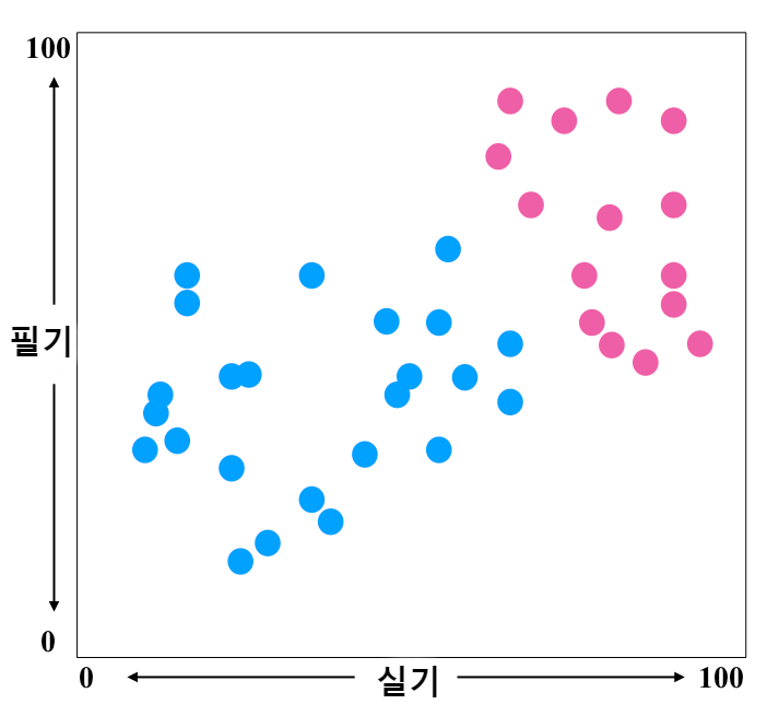 동일한 시험을 친 사람의 점수 분포가 다음과 같을 경우를 생각해 봅시다. 빨간 점이 합격자 점수, 파란색 점이 불합격자의 점수입니다.
