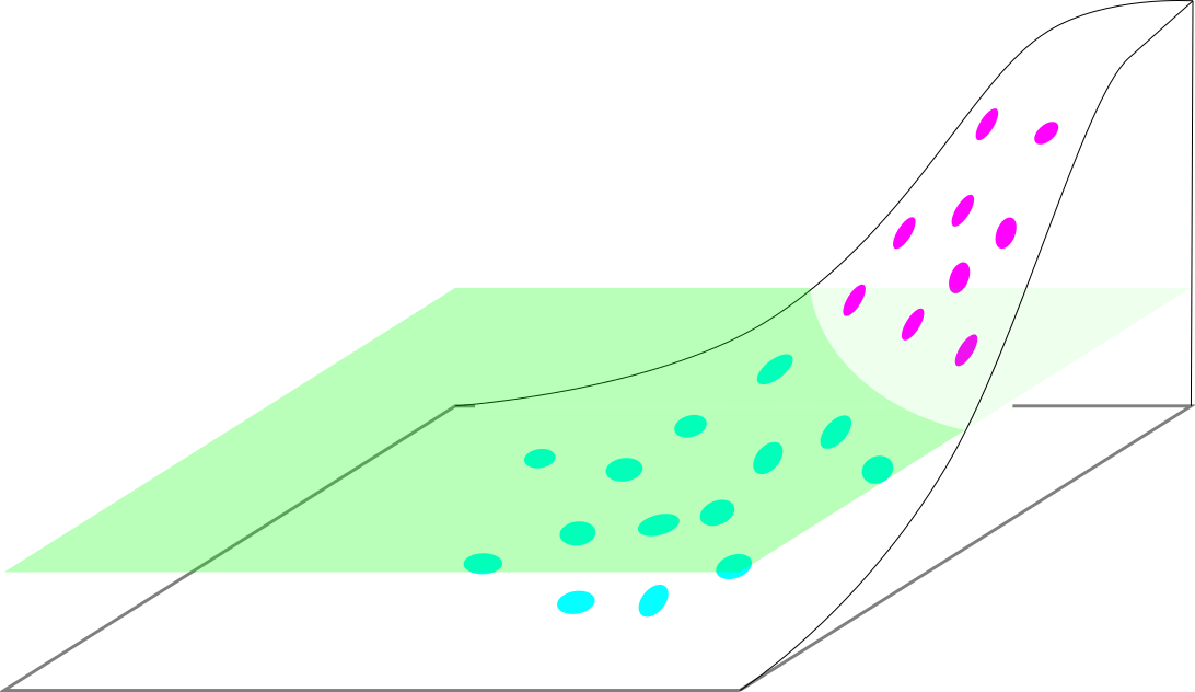 녹색 선처럼 곡선으로 분류하고 싶지만, 아래와 같이 특정 공간을 기울여 버리면 평면으로도 분류가 가능합니다.