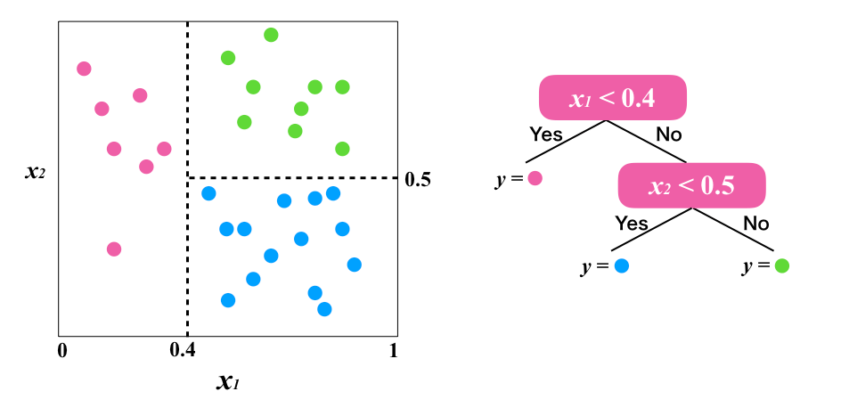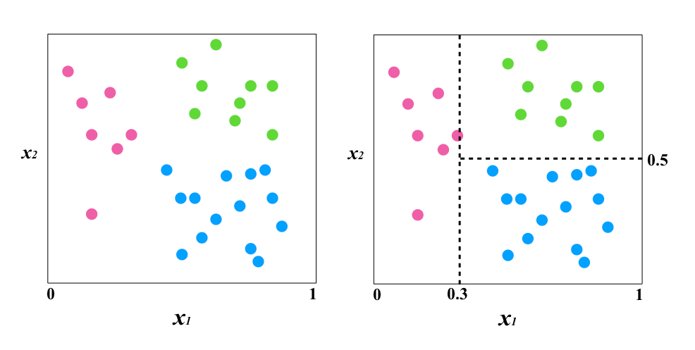 그럼, 다음으로 분류의 경우를 살펴보고자 합니다. 분류의 경우에는 데이터를 여러 그룹으로 나누어 갑니다. 예로 아래 데이터를 보세요. x1과 x2라는 파라미터를 갖는 데이터가 흩어져 있습니다. 분류를 위해서 먼저 x1이 0.3보다 큰가 작은가로 데이터를 나눕니다. 그 후 0.3 이상인 데이터를 x2가 분류합니다. 이제 훌륭하게 경계선이 그어졌습니다.