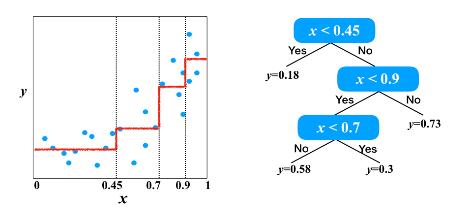 완성된 선은 삐뚤빼뚤 하지만, 이 선만 있으면 'x가 이 범위 안에 있으면 y는 이 값이다'라고 말할 수 있습니다. 위 그림과 같이 조건 분기를 도식화하며 가지를 뻗어가며 그리기 때문에 결정 트리라는 이름이 붙어있어, 특히 회귀분석에 사용되는 경우 회귀 트리로 불리기도 합니다.