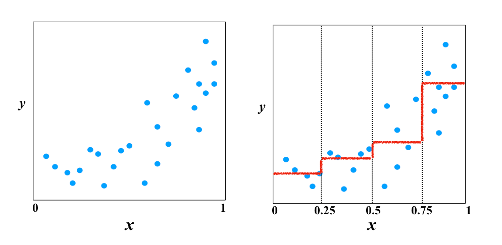 앞에서 AI가 해결할 수 있는 문제는 '분류'와 '회귀'로 크게 나뉜다고 했습니다만, 의사결정 트리는 양쪽 모두 사용할 수 있습니다. 우선 회귀를 살펴봅시다. 회귀는 점의 집합으로부터 알맞은 선을 찾아내는 방법이었습니다. 의사결정 트리는 조건문을 이용하여 선을 그어갑니다.