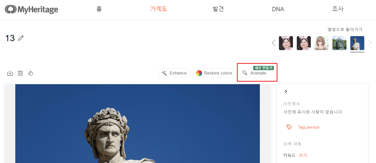또한 애니메이션은 원 패턴이 아닙니다. 애니메이션의 패턴을 변경하려면 페이지 상단의 '가계도'에서 '내 사진'을 클릭합니다.