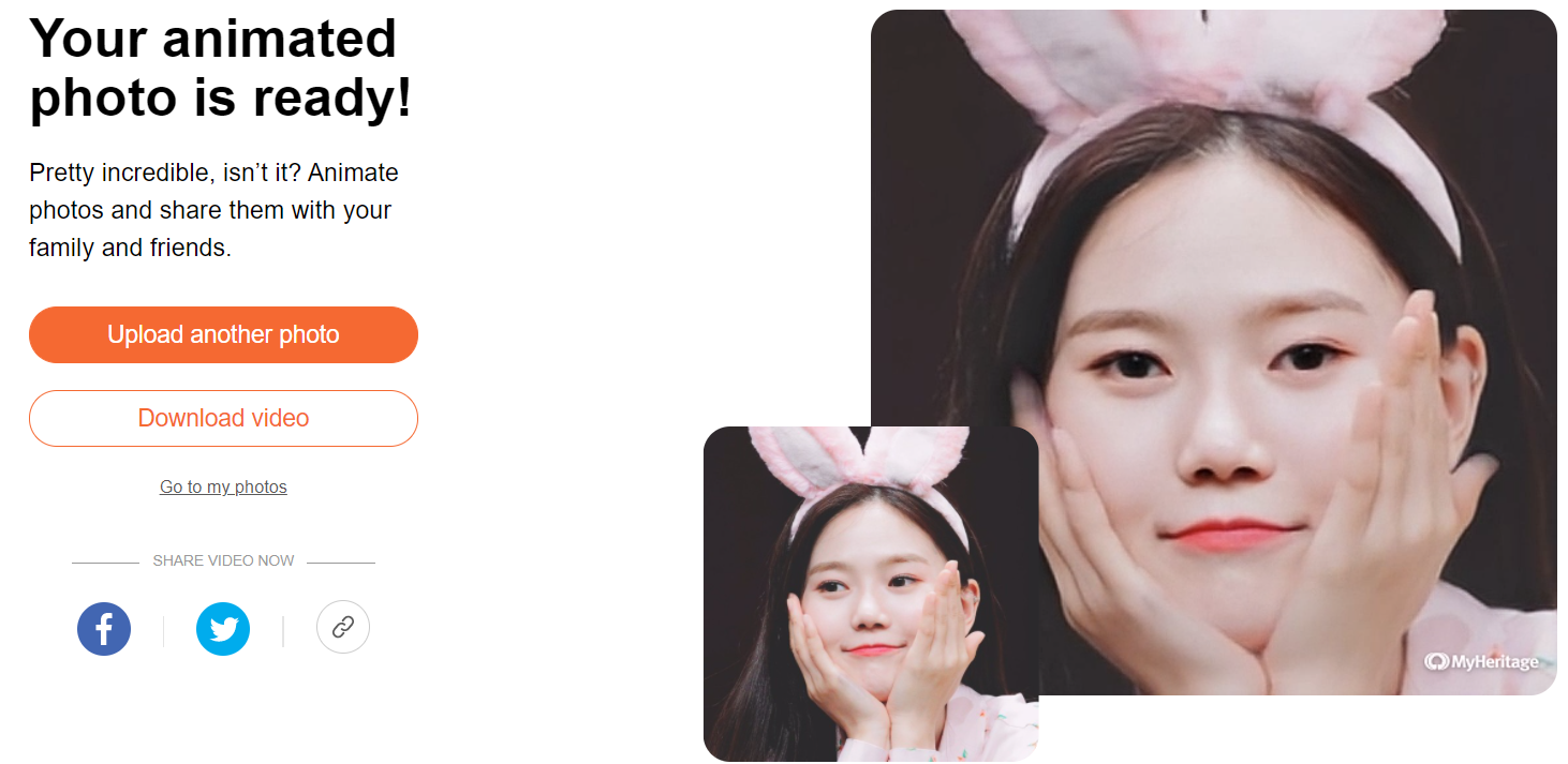 처리가 끝나면 얼굴을 상하 좌우로 움직이는 영상이 흐르기 시작합니다. 눈동자를 움직이며 윙크를 하고, 가끔 입가를 희미하게 움직이는 모습은 마치 살아있는 것 같고, 조금 섬뜩할 정도의 솜씨입니다. "Download video"를 클릭하면 MP4 파일로 다운로드가 가능하지만, 구독 서비스에 가입하지 않으면 동영상의 우측 하단에 MyHeritage 로고 마크가 들어갑니다.