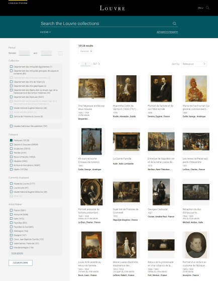 왼쪽 메뉴에서 작품이 태어난 시대, 종류, 카테고리, 현재의 공개장소, 저자의 출생 등을 필터링할 수 있습니다.