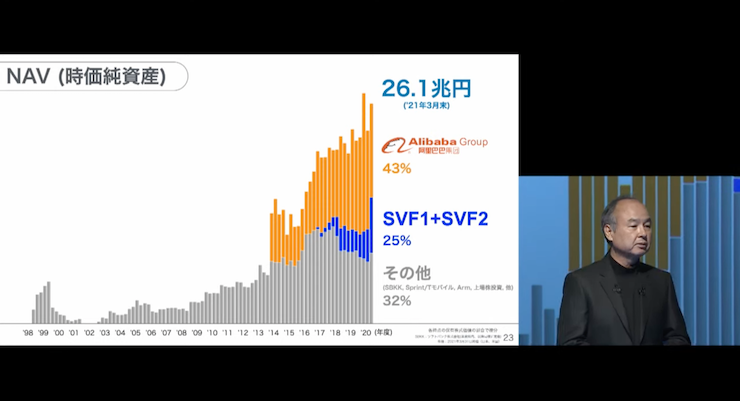소프트 뱅크의 NAV(시가 순자산)는 2021년 3월 말 26.1조 원을 기록하고 있습니다. 소프트뱅크 그룹의 투자라고 하면, 알리바바의 인상이 강할지도 모릅니다. 그러나 손정의 씨는 이렇게 말합니다.