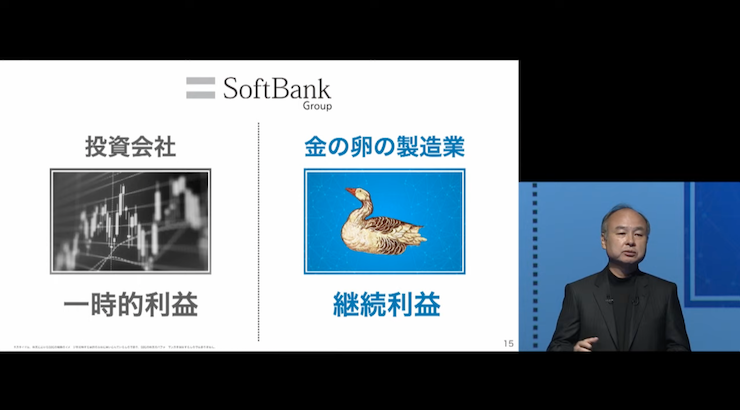 소프트뱅크 주식회사 대표이사역 회장 겸 사장 집행 임원인 손정의 씨는 소프트뱅크 비전 펀드 투자에 대해 "같은 투자 회사라도 일시적인 도박처럼 시세가 내렸다 올랐다하는 일희일비가 아니라, AI를 사용하여 새로운 비즈니스 모델과 신기술로 산업을 재정의하는 회사들을 자꾸자꾸 만들어낼 것입니다."라고 말했습니다.
