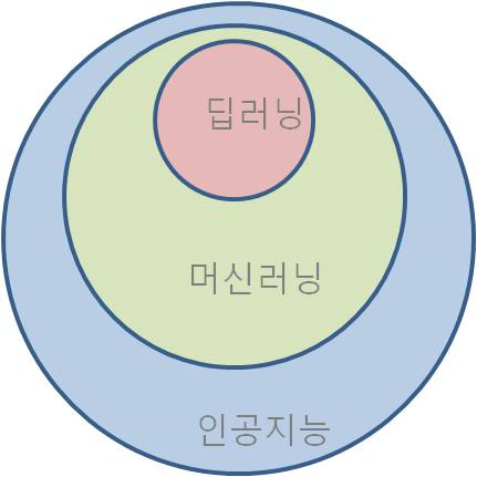 AI, 머신러닝, 딥러닝의 관계를 그림으로 나타내면 다음과 같습니다. 가장 넓은 의미를 담고 있는 것이 AI(인공 지능)이며, 따라서 AI라는 말을 엉성하게 사용해 버리면 그 가리키는 단어의 범위가 넓고, 매우 알기 어려운 경우가 많습니다.