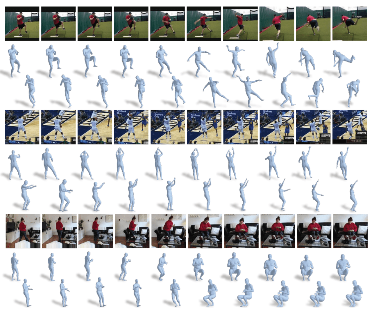 이번 연구의 목적은 한마디로 표현하면 '스틸 이미지 속 인물의 3차원 모션을 복원하는 것'입니다. 구체적으로는 그림 1과 같이 비디오 중 어느 시점 프레임에서 과거, 현재, 미래의 일련의 동작을 복원합니다. 저자는 이 도전적인 목표를 달성하기 위해 ResNet을 바탕으로 한 모델을 구축하고 제안했습니다.