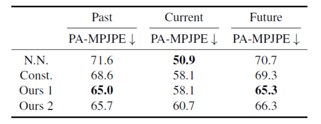 스틸 이미지 속 인물의 3차원 모션 복원을 시도한 것은 이번 연구가 처음이며, 기존 연구가 존재하지 않기 때문에 비교 기준이 존재하지 않습니다. 그래서 현재의 프레임워크에서 과거와 미래의 프레임 워크를 예측했을 때의 예측 성능(Const)과 가장 가까운 이웃에 의한 예측 결과(NN)를 기준으로 설정했습니다. 또한 Ours 1은 hallucinator에 의해 생성된 인간의 움직임을 표현하는 특징량과 실제의 특징량 Φ의 오차가 제안 모델의 오차 함수에 포함된 모델이며, Ours 2는 포함하지 않은 모델입니다. 표를 살펴보시면 제안된 방법이 과거와 미래의 프레임워크 예측 정확도에서 우수한 결과를 내는 것을 알 수 있습니다.